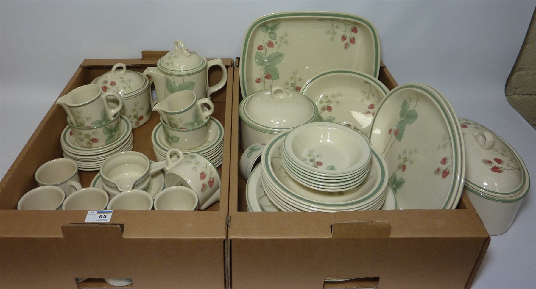 Comprehensive Wedgwood 'Raspberry Cane' dinner and tea/coffee service - six place settings plus extra pieces - in two boxes