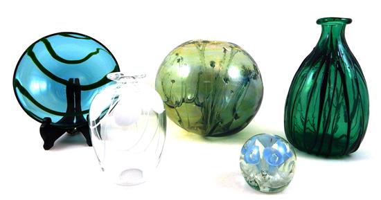 Harkness vase or decanter, 9 3/4" h., and serving bowl, 8" dia., both green with raised applied dark green decoration, both signed "Harkness" underside bases; globular sculpture with stalactite drops interior, signed and dated "Bramhall, 7/4/74" unde
