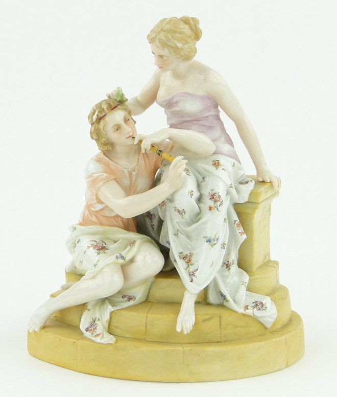 Continental porcelain group, depicting Classical maiden and flute player, height 8''.