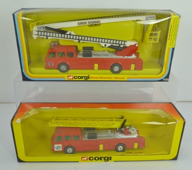 no.1126 1979, in original vending box, together with a CORGI DENNIS FIRE ENGINE no.1120 1984 in red with blue tinted windows and roof lights, lifting, rotating and extending ladder, pull-out yellow stabilizers,crest and unit number 8 to cab door, in