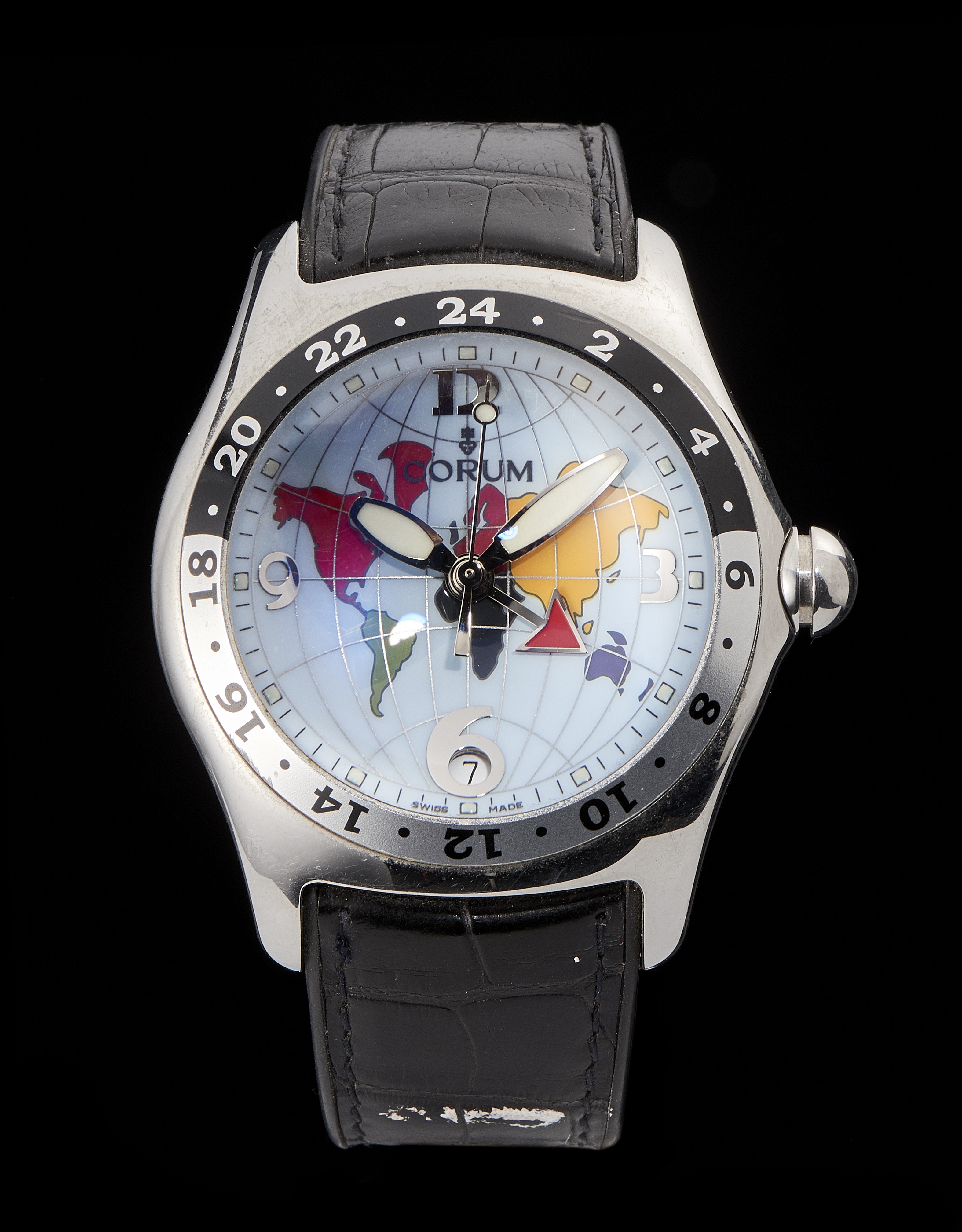 Dial decorated with a map of the world, Arabic numerals and silver hands, curved glass, date window at 6 o'clock, ref. 383.150.20, steel, D 42 mm, in its case