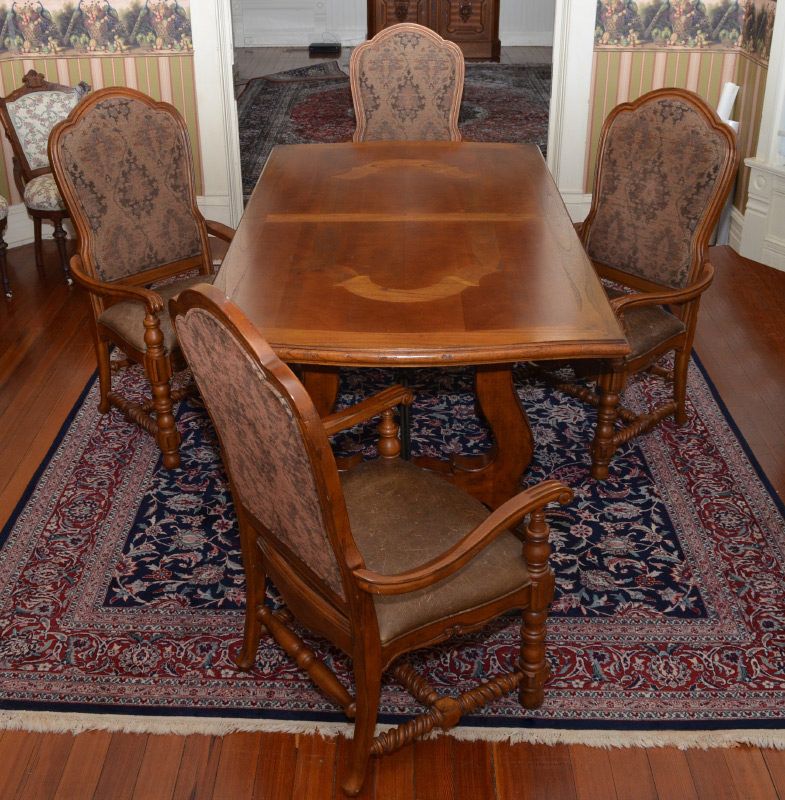 From the Historic Bailey House in Fernandina Beach, FL. Rectangular top table with shaped ends, double harp pedestal bases with decorative metal stretcher, 30 3/4'' h. x 80 1/2'' x 43 1/4'', the two leaves measure 20''. Sold with 4 carved arm chairs