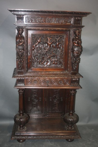 Credenza in walnut molded and carved with leafy terms, gadroons, shells, rosettes, plumes. He opens a sculpted leaf of a wild boar hunting scene and a drawer in the headband.