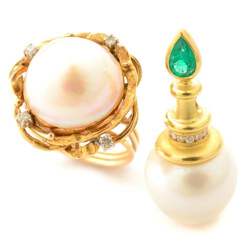 Including one semi off-round south sea cultured pearl measuring approximately 14.5 mm, accented by one pear-cut emerald weighing approximately 0.15 ct., further enhanced by full-cut diamonds weighing a total of approximately 0.10 cttw., set in an 18k