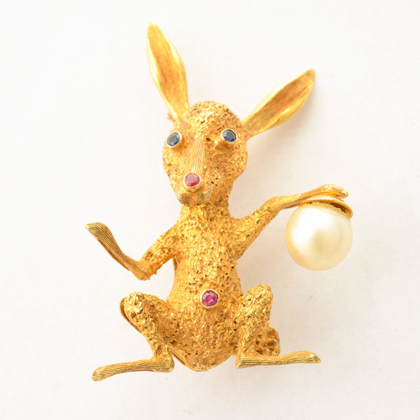Designed as a jack rabbit holding a 7.7 mm cultured pearl, featuring two round-cut sapphire eyes and two round-cut rubies on the nose and belly, set in a textured, 18k yellow gold mounting, completed by metal pin stem and measuring approximately 45 x