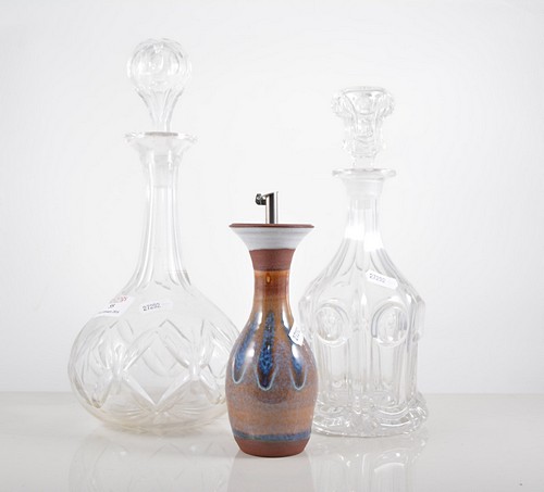 Cut glass globe and one decanter, with stopper, height 31cm, three other decanters and an oil pot, (5).