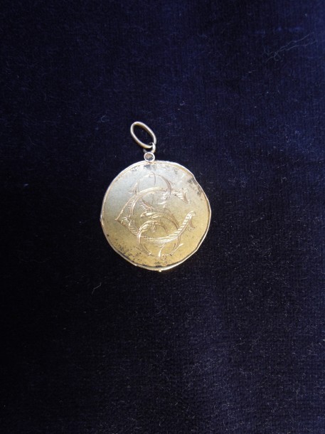 In a case: Guilloche gold pendant forming a violin, Weight: 1gr Gold medal monogram SE, Accidents, Weight: 6.15gr CONTROLE Stylized hortancia frome brooch in gold and cultured pearls. Ponçon horse head, Gross weight : 2.64 gr, 1 gilded metal cuffl