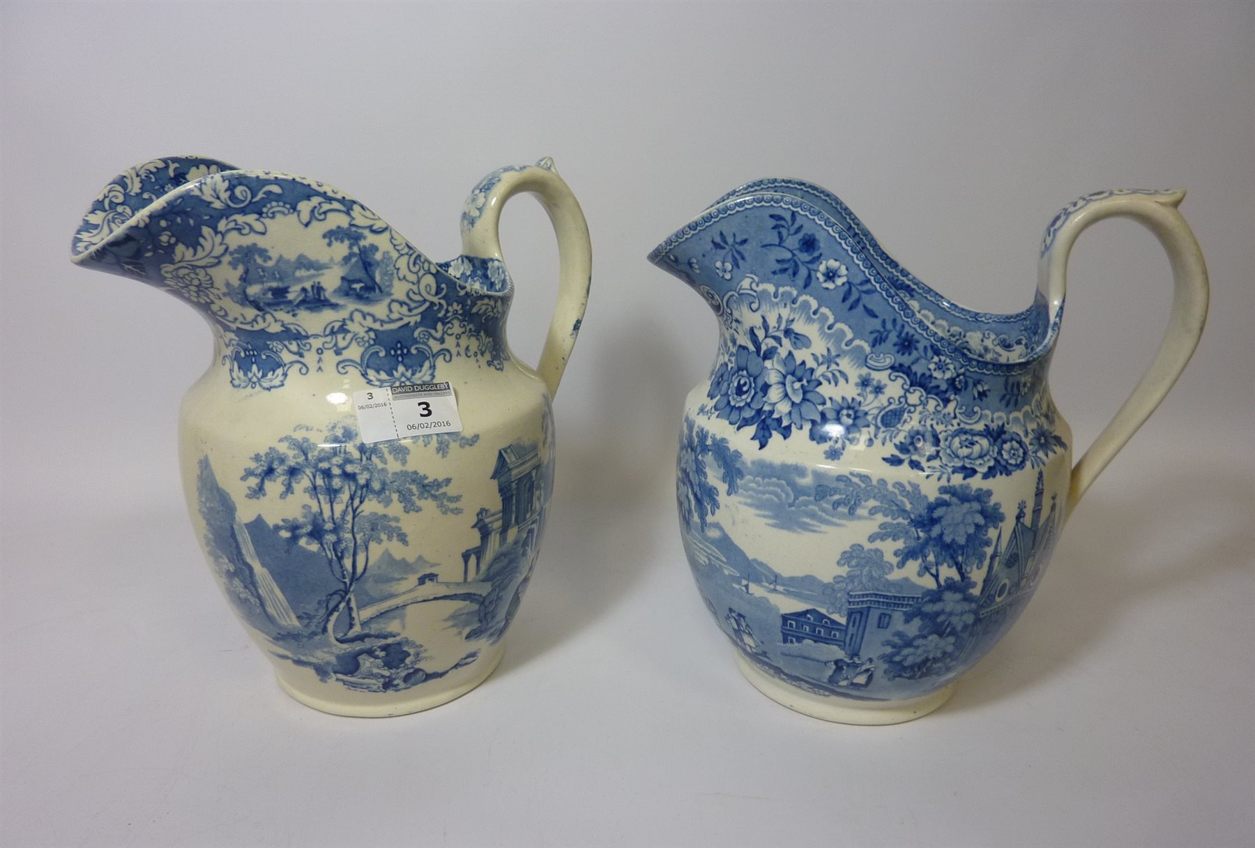 Davenport 'Geneva' pattern blue and white jug H23cm and a similar size jug decorated with a classical style landscape