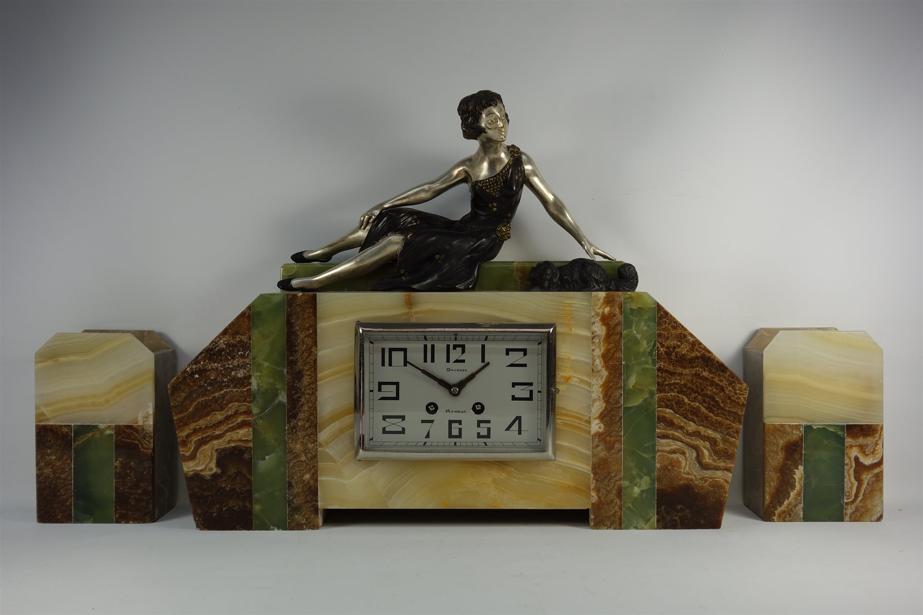 Davoust Mamers Art Deco figural marble three piece clock garniture
