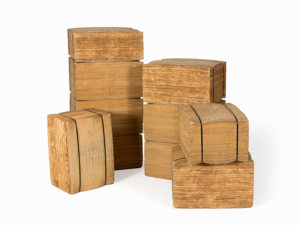 Installation with 10 archive blocks from cardboard Dimensions: c. 33 x 59 x 42 cm