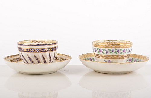pattern no. 82, circa 1790, decorated with a band of flowers within gilt leaf borders, puce marks, saucer diameter 14cms and another Derby tea bowl and saucer, pattern no. 66,