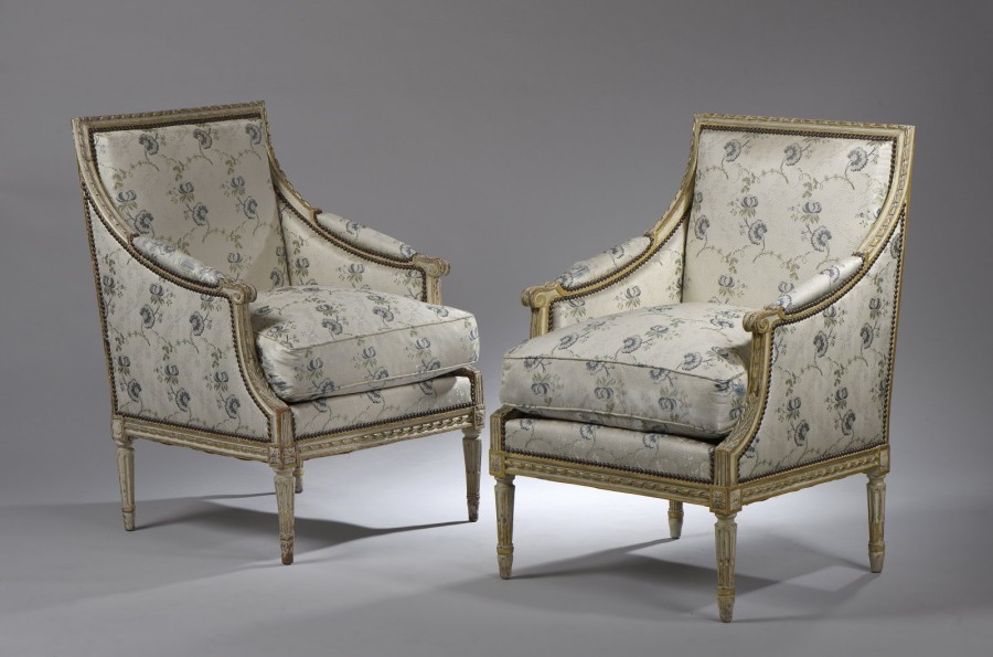 Deux bergères en bois laqué crème et or, dossier plat, reposant sur des pieds cannelés rudentés. Décor de fleurettes, rubans et palmettes.