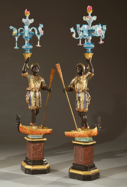 Deux nubiens porte-torchère sur gondoles, en bois sculpté et polychromé reposant sur un socle parallélépipédique.