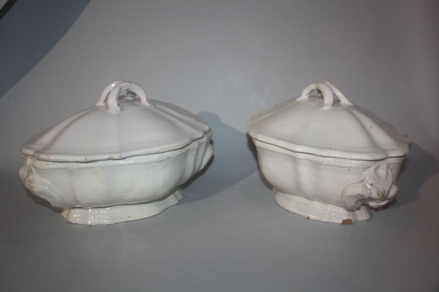 Deux terrines oblongues couvertes à bord contourné et légèrement godronné en faïence à émail blanc.
