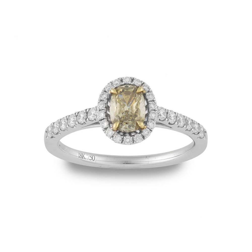 claw-set to the centre with an oval brownish yellow diamond weighing approximately 0.48 carat accented with round brilliant-cut diamonds, the tapering shoulders pavé-set with round brilliant-cut diamonds, size M