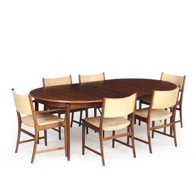 consisting of table with extensin, two extra leaves and six chairs.