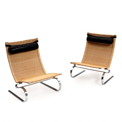 A pair of high-backed easy chairs with chromed steel frame covered with wicker.