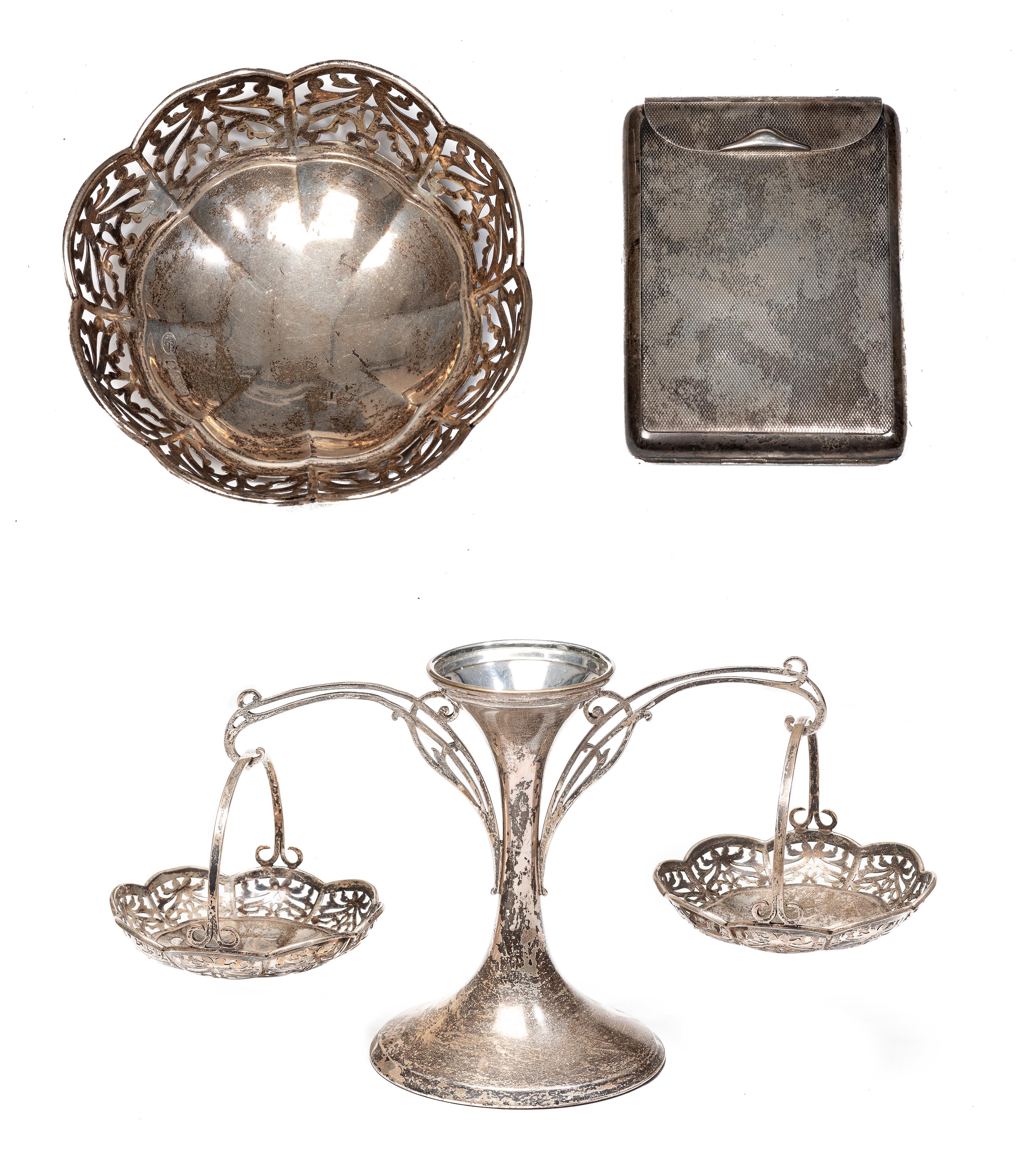 Coupe sur piédouche en argent sterling anglais .925 par The Alex B. Clark Company Ltd London comprenant la coupelle à marli ajouré en médaillons sur pied amovible à 2 paniers de même facture. Birmingham 1911. H. 16.5x26x13.6 cm On y joint un porte-