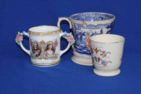 with a hunting scene running round the body, damaged; together with a George V silver jubilee twin handled Paragon cup and another silver jubilee mug by Burleigh ware, both with damages, blue and white mug 11.5cm high (3)