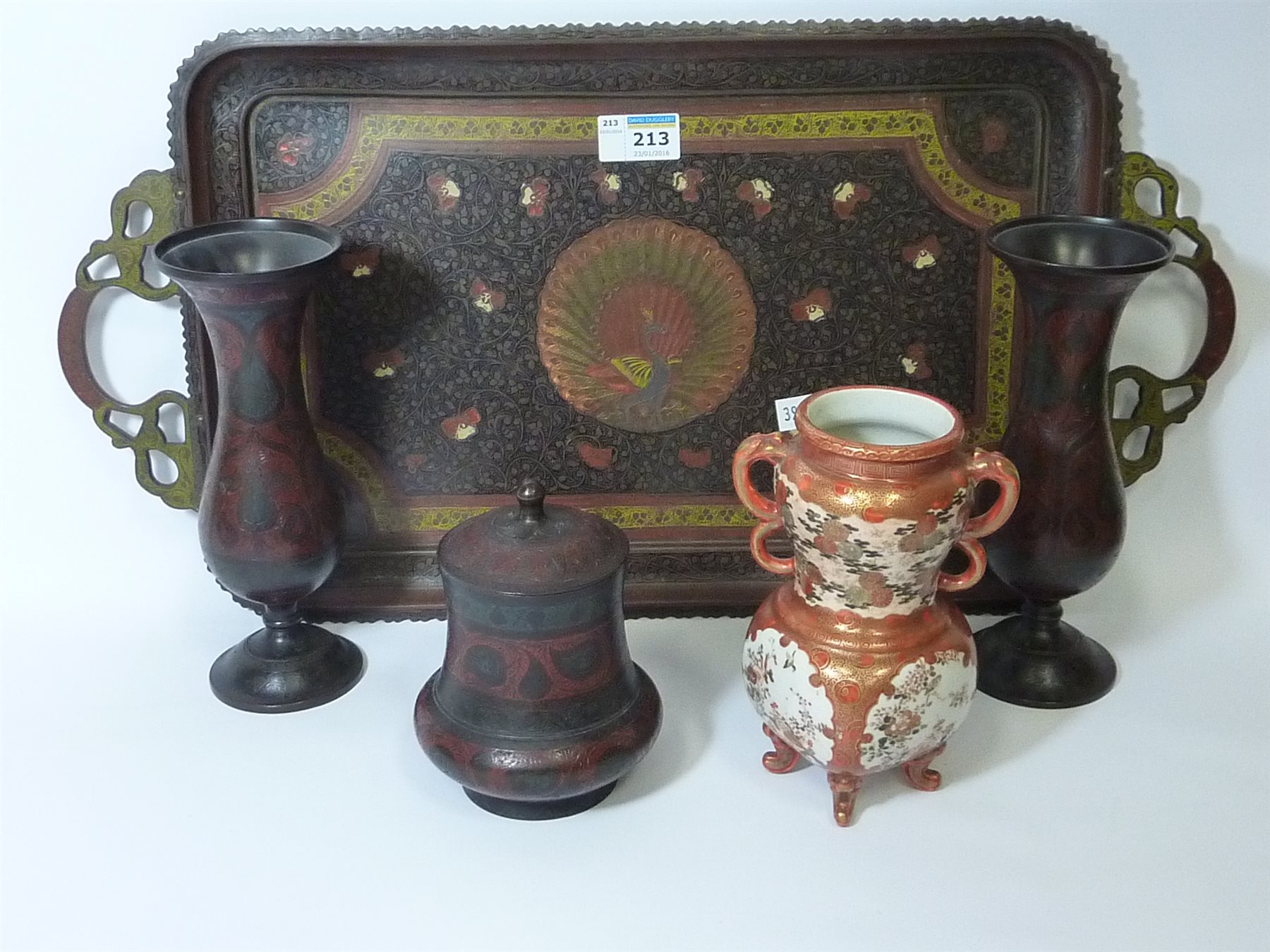 Early 20th century Japanese Satsuma vase, signed H18cm, Eastern metalwork tray, similar vases and a matching lidded pot (5)