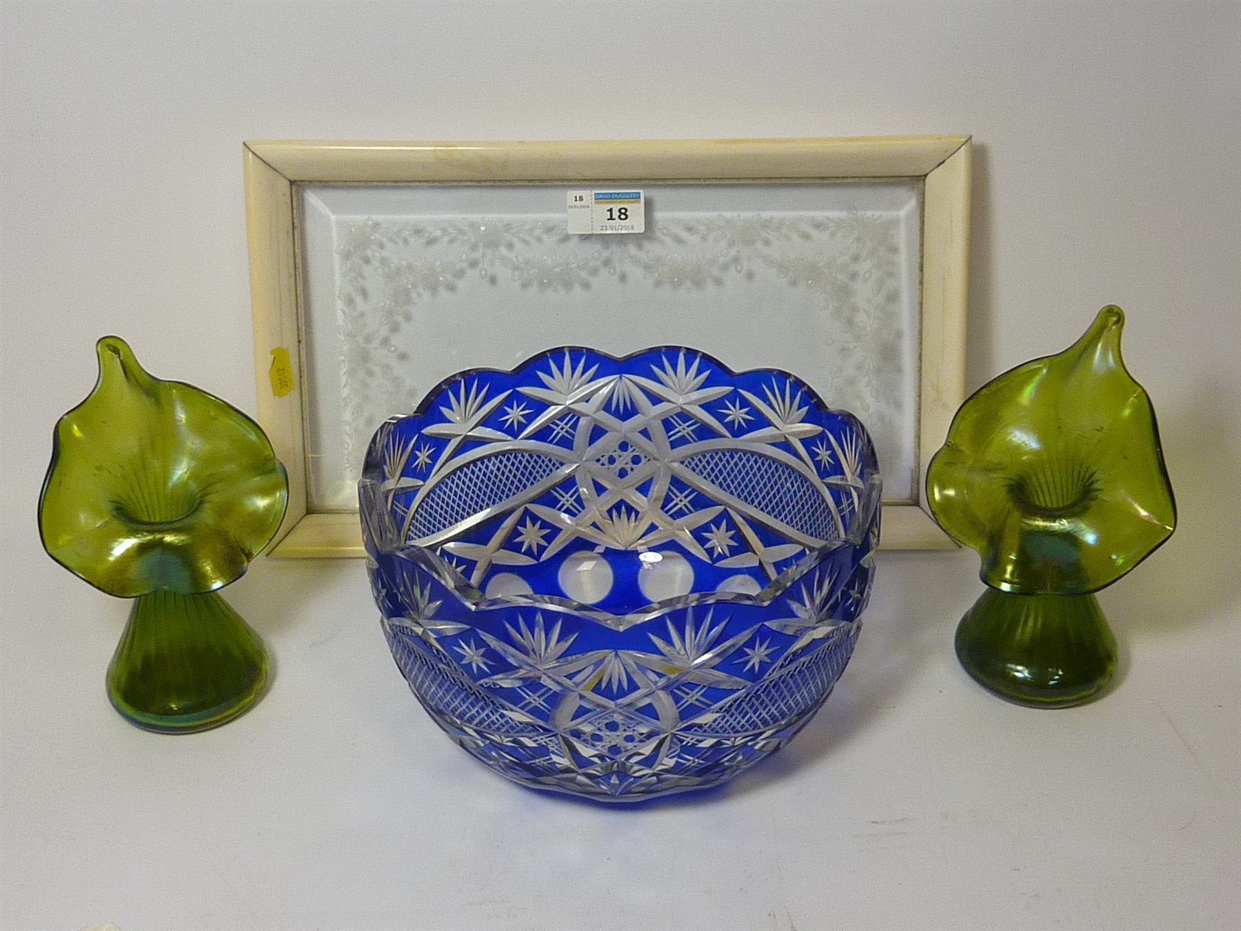 early 20th century ivory and etched glass dressing table tray, and a cut crystal bowl with blue overlay