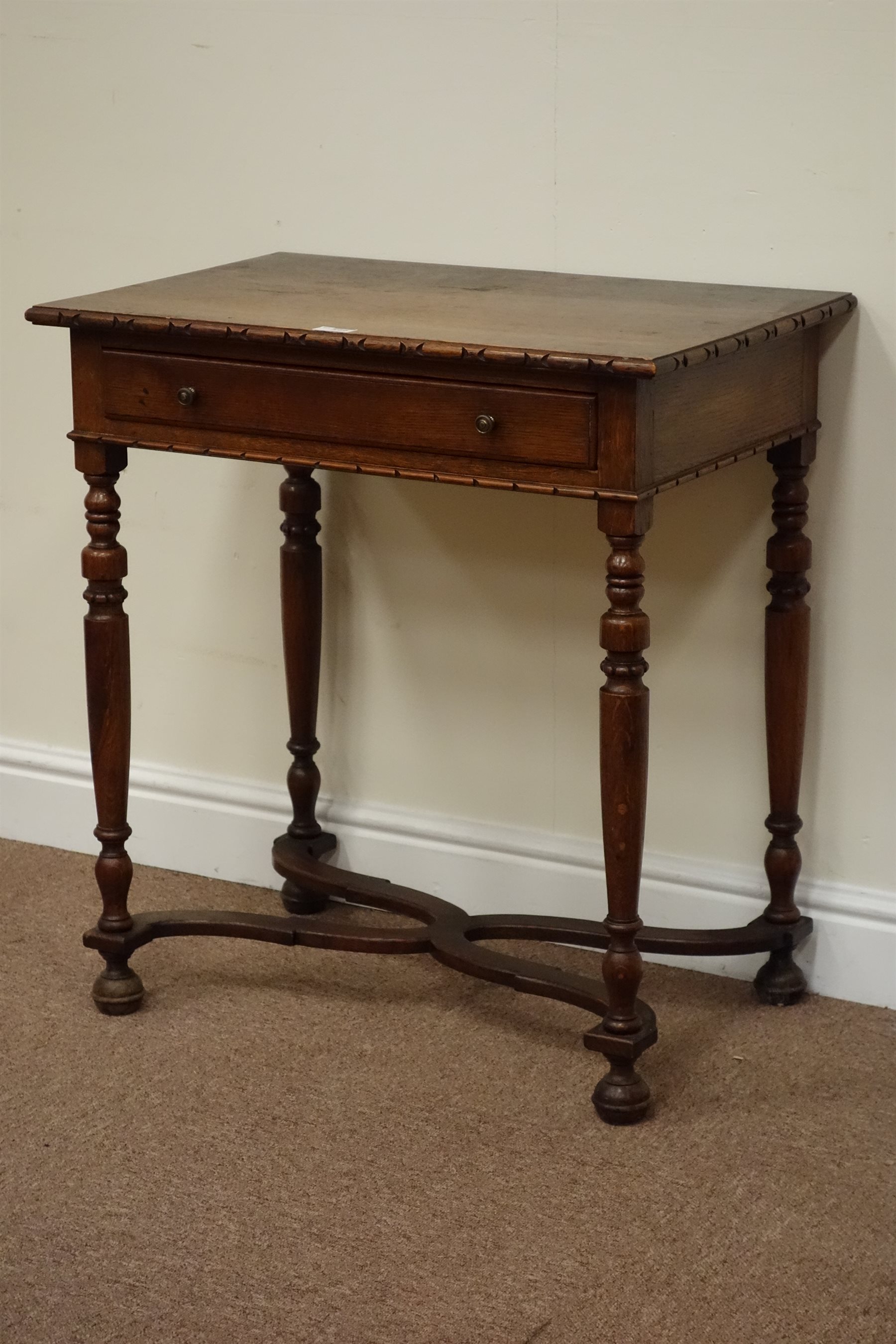 Early 20th century oak side table fitted with single drawer, shaped x-framed stretcher and turned base