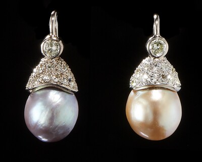 Earrings each holding a fine pearl drop, one gray and the other "light brown" enhanced with diamonds