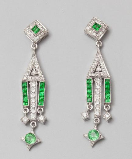 Earrings in white gold, 750 MM, drawing three pendants adorned with diamonds and tsavorite