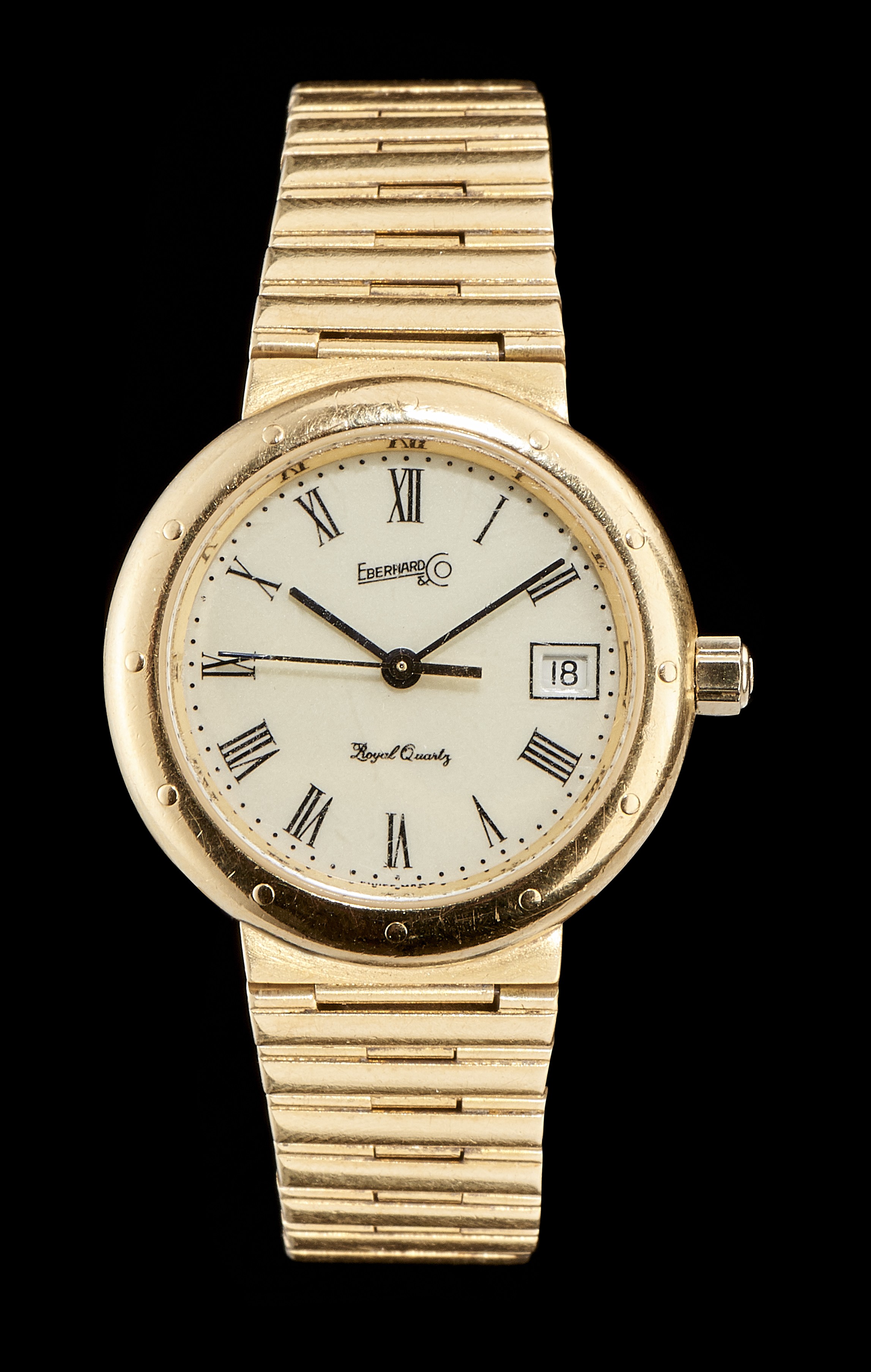 Cream dial, Arabic numerals and black hands, date window at 3 o'clock, 750 gold, D 26 mm, gross weight 45 g
