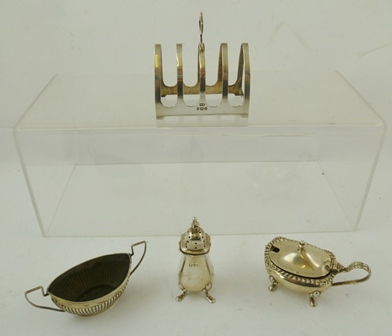 EDWARD VINER A SILVER FOUR-SLICE WIRE TOAST RACK, Sheffield 1950, and THREE OTHER MISCELLANEOUS CONDIMENTS, various, total weight 158g.