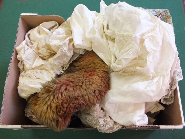Edwardian child's mauve velvet boots and child's clothing, lace, etc