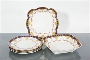 comprising four side plates and two shaped square dishes, each decorated with floral swags and bows on an ivory ground, with colbalt blue banded rim with gilt highlights, puce printed mark to base, approximately dated 1901, the shaped dish 23.5cm wid