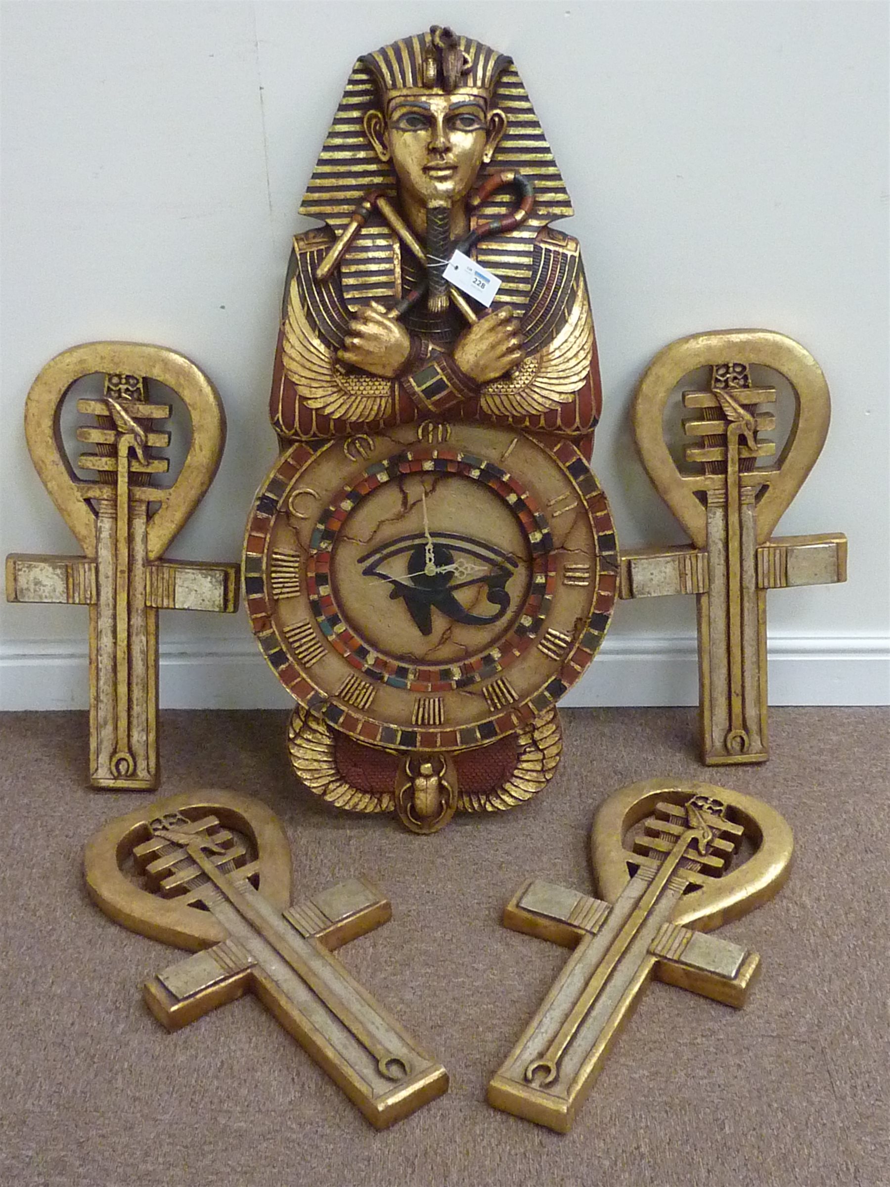 Egyptian design wall clock surmounted by a pharaoh H100cm, and three wall mounted gold ankhs (5)