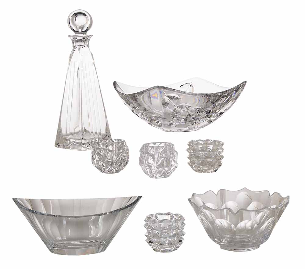 Articles 20th century: Cartier cut crystal oval bowl with faceted sides, signed "Cartier", height 4-1/4 in., [rim chip; cut crystal petal-form bowl by Josair of Germany, signed "Cartier" on base, height 4 in., [good condition; Tiffany & Co. [Metropol