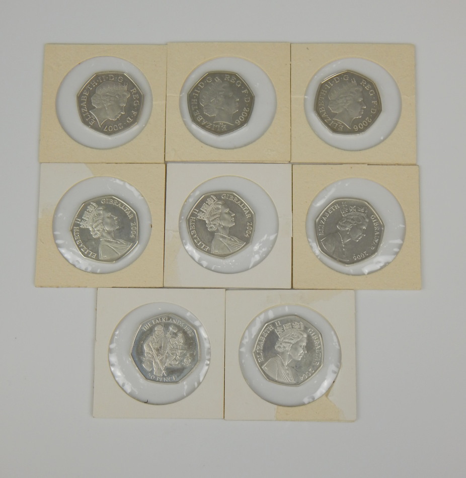 Eight silver 50 pence coins, various dates