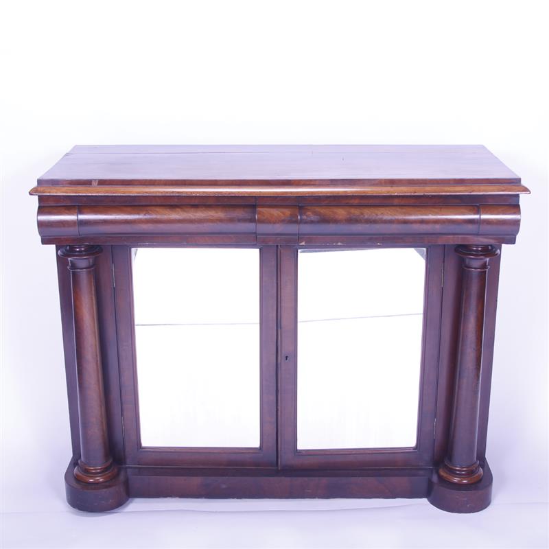 Empire hall console cabinet with petticoat mirror; flame mahogany veneer