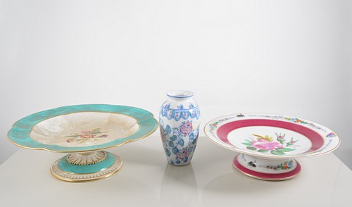 English pottery dessert service, enamelled flowers, green border, comprising six plates, diameter 25cm, a pedestal bowl and three comports, (a.f.), Maling bowl and other ornaments, (1 box).