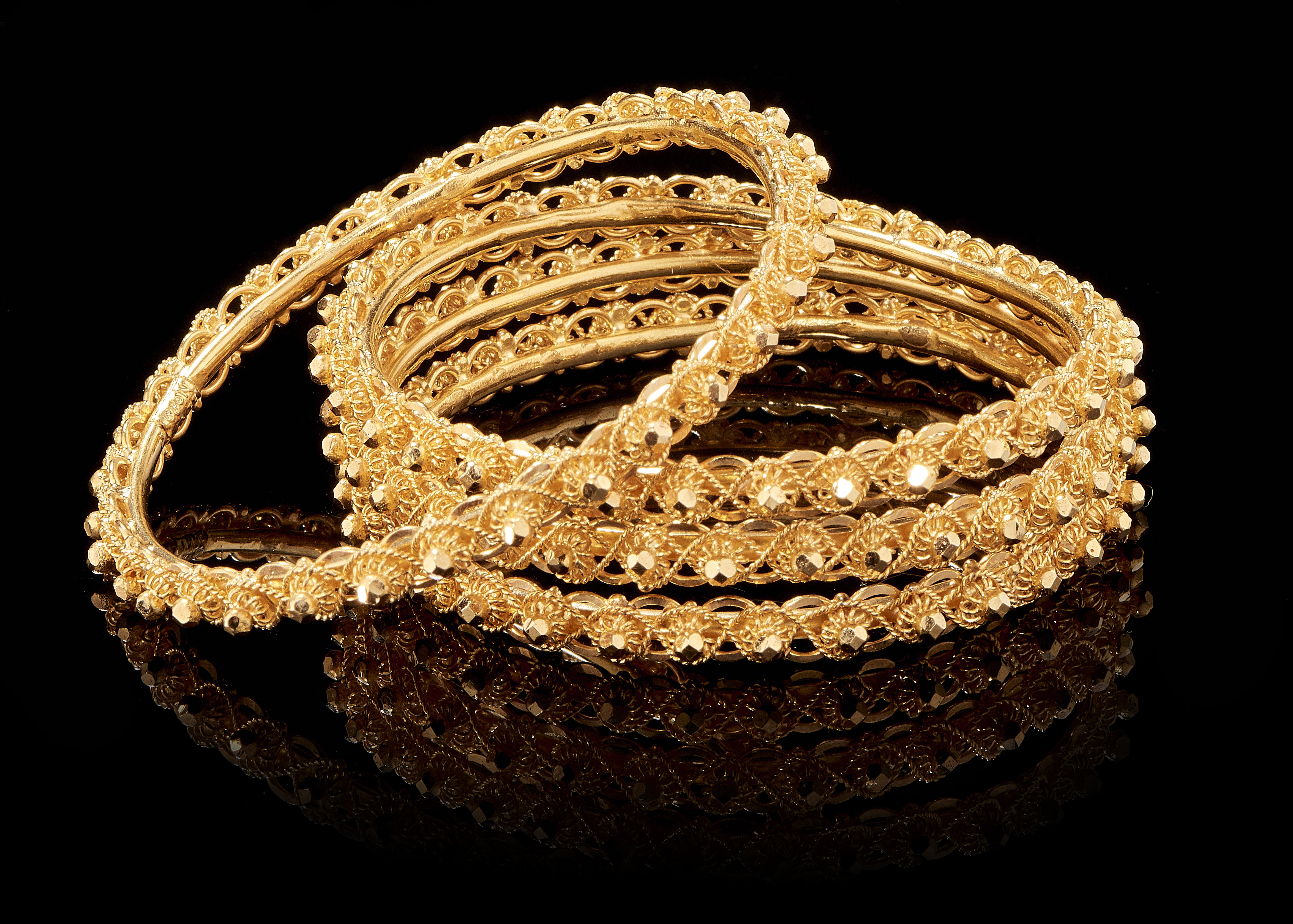 Ensemble de quatre bracelets joncs à décor filigrané Or 750, D 5,5 cm, 78 g