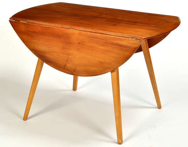 An elm drop leaf dining table, the oval top on rounded square tapering legs