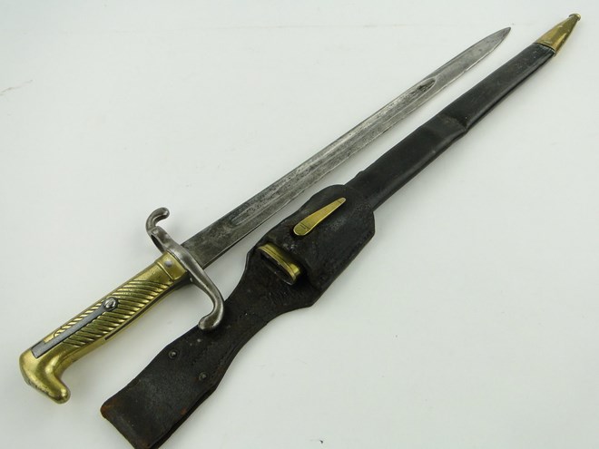 A bayonet by F A Hermes, Solingen, engraved I Xgb II.3.66 complete with scabbard and frog, 24.25''.