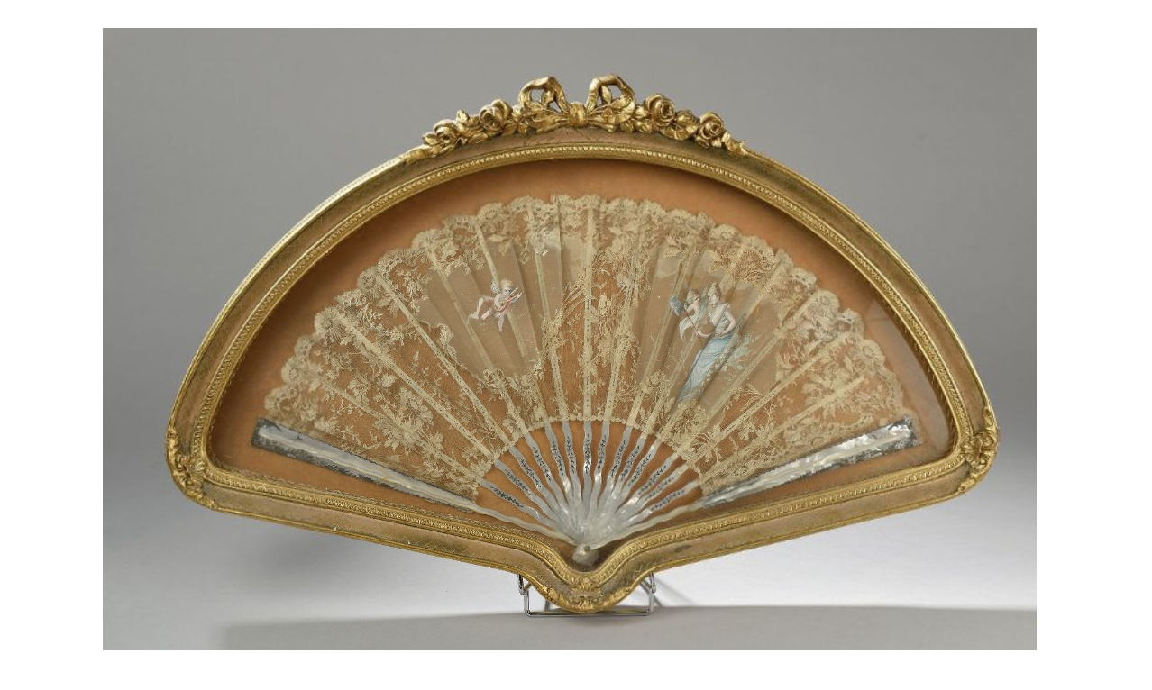 Fan painted lace, pearl strands. Late nineteenth century. Box.