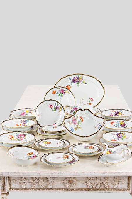 Sechs Speiseteller (Ø 25 cm), sechs tiefe Teller (Ø 23,5 cm), sechs Dessertteller (Ø 16 cm), sechs Abendbrotteller (Ø 21 cm), quadratische Schüssel, runde Schale, Saucière, ovale Schale, Ragoutterrine, Fleischplatte. Reicher Feldblumendekor mit golds