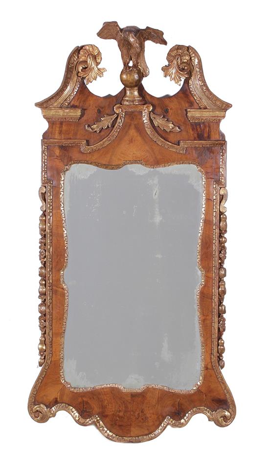 Fine George II parcel-gilt walnut mirror mid 18th century, eagle finial atop broken-arch pediment and carved molded floral-decorated frame, H56" W28"