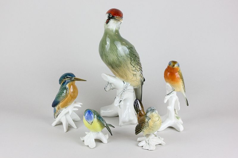 Five Karl Ens porcelain figures of birds including a large green woodpecker