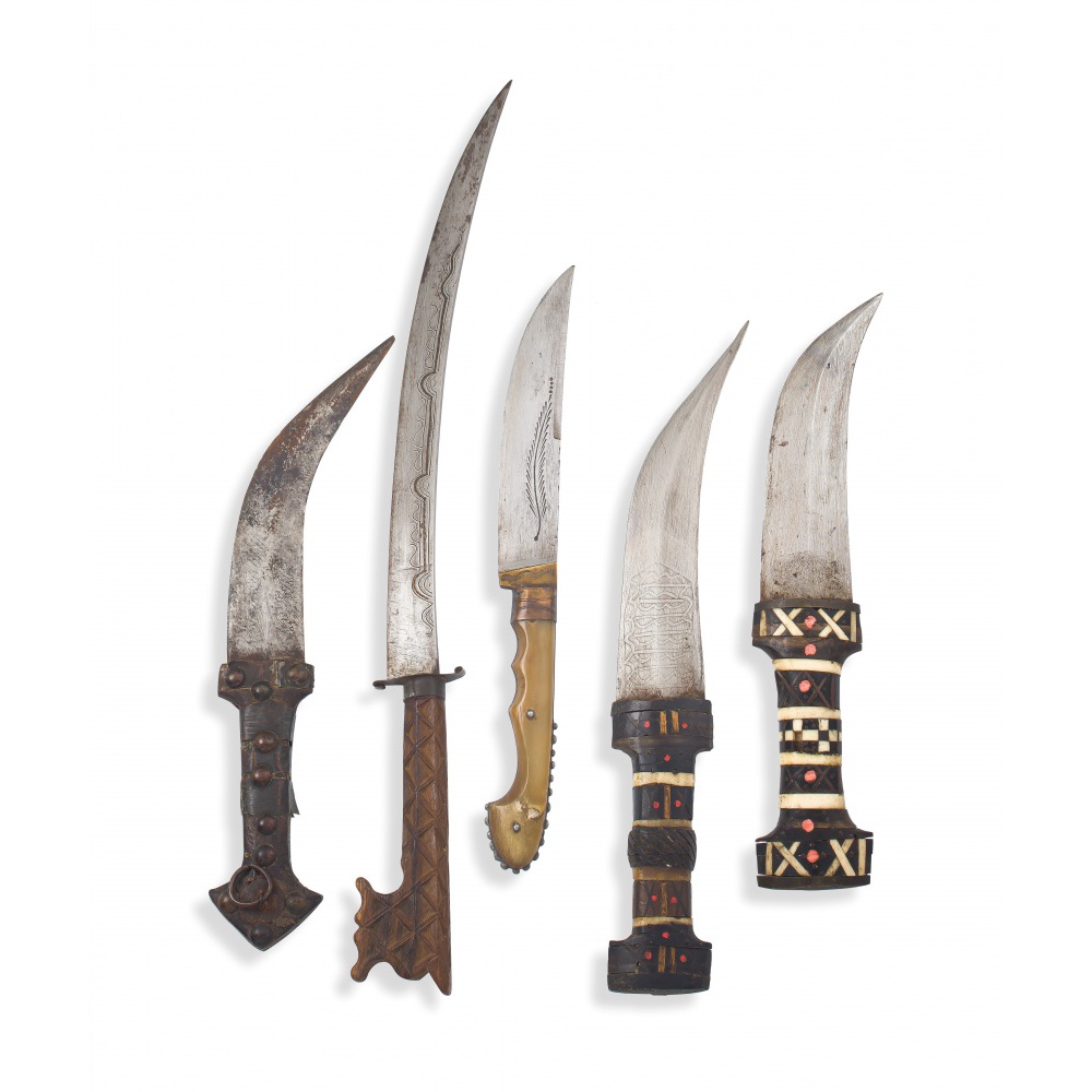 "the first with wooden hilt carved with diamond-shaped motifs and scabbard, the curved blade engraved and inlaid with brass, the blade 28,5cm long; a horn dagger, the blade with leaf decoration, the forte and collar of engraved copper and brass, the