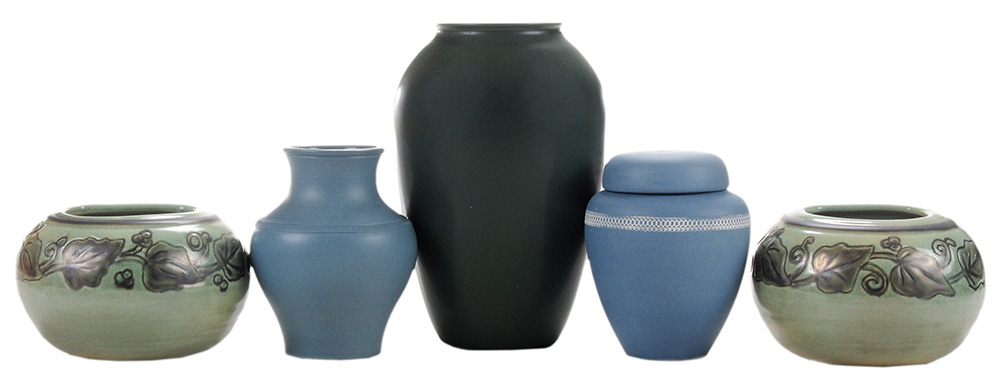 pair green-glazed North Dakota School of Mines planter bookends, each with etched brown/black banded floral design, base with "University of North Dakota Grand Forks Made at the School of Mines", "177MC", 4 in., good condition; finely potted vase wit