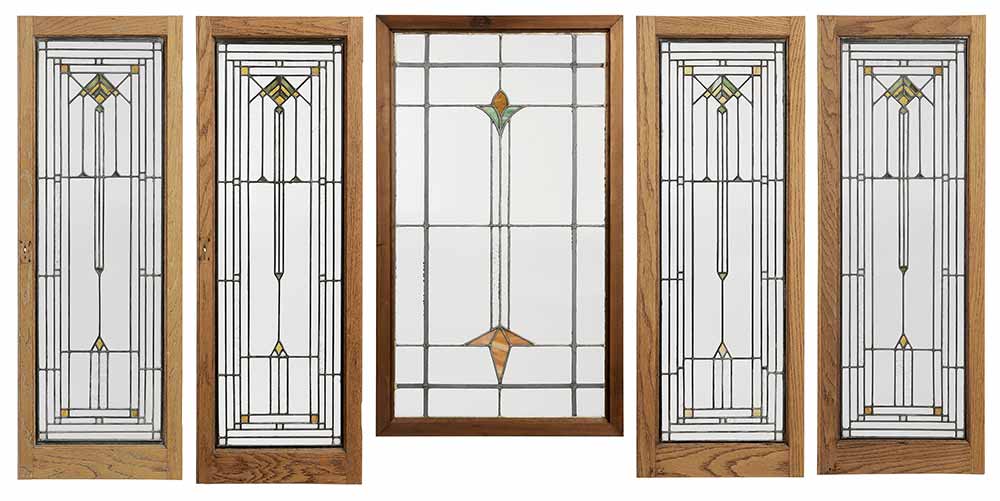 Glass Windows set of four, finely crafted leaded glass panels with clear, amber, green, white and crackle glass, stylized flowers, oak frames, one side with hinge cutouts, 43 x 14-3/4 in., [one with two cracked glass segments, the other three in good
