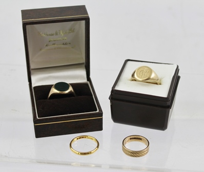 FOUR 9CT GOLD RINGS, comprising two wedding bands and two gentlemens signet rings, one inset with polished stone, the other monogrammed, overall weight 15g. (including stone)