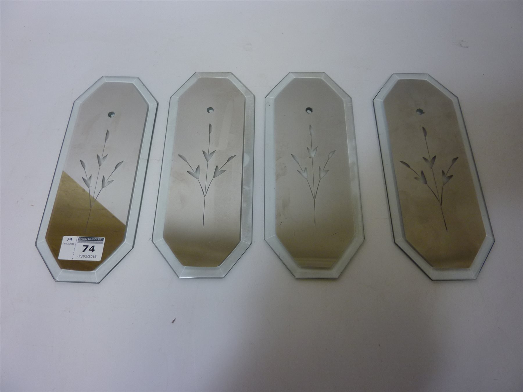 Four Art Deco period etched mirror door plates