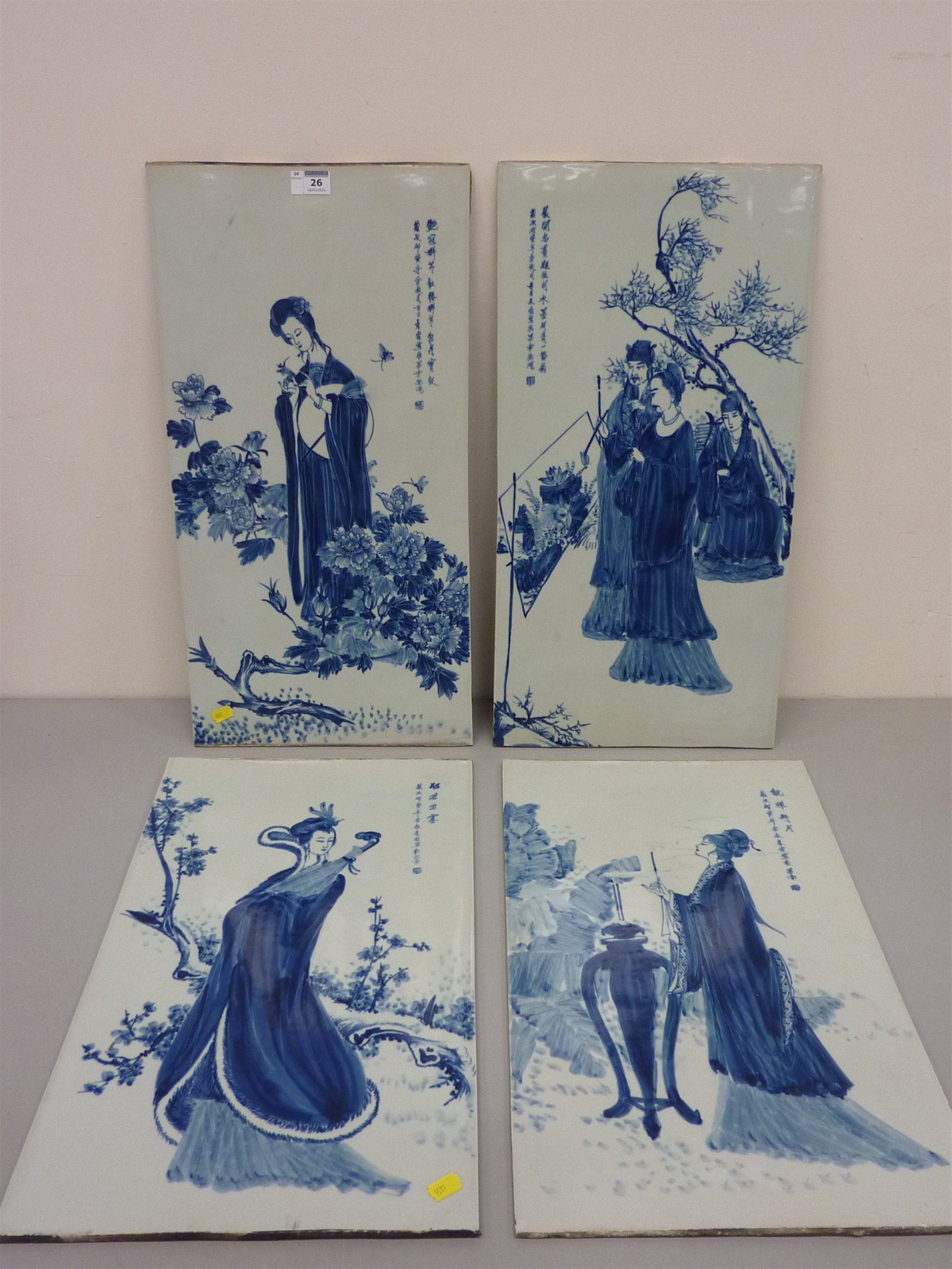 Four Chinese blue and white ceramic panels representing the Four Seasons, all approx